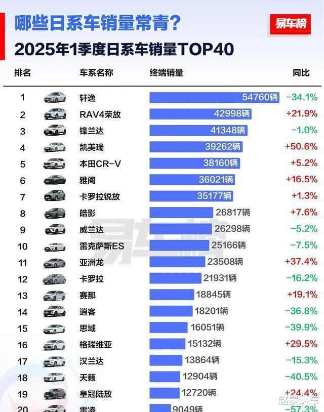 官宣! 25年1季度日系车销量排名: 轩逸暴跌34%, 荣放、雅阁进前十